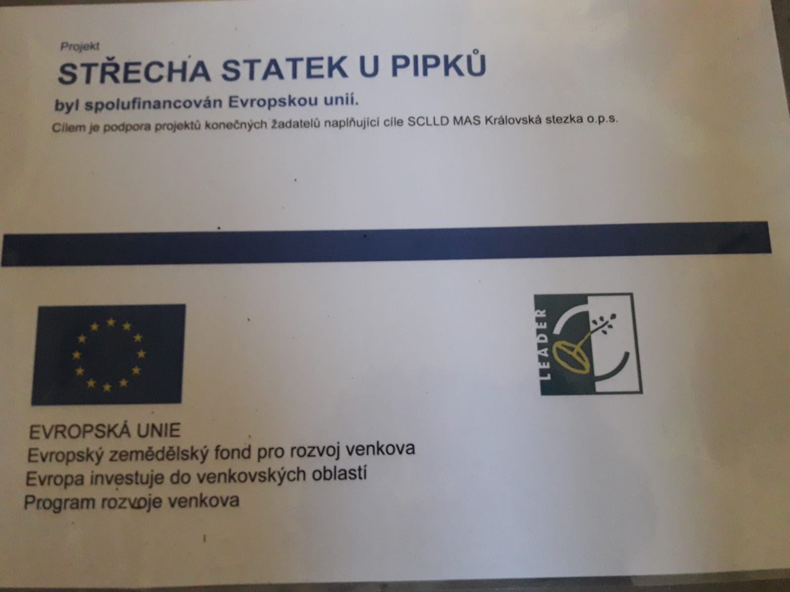 Projekt Střecha statek u Pipků byl spolufinancován Evropskou unií. Jeho cílem je podpora projektů konečných žadatelů naplňující cíle SCLLD MAS Královská stezka o.p.s. V rámci projektu došlo k modernizaci a zvýšení prosperity statku. Obnova zastřešení statku umožnila nabídnout lepší zázemí pro návštěvníky jak v již opravené části budovy, tak v prostoru stodoly a kvalitativně rozšířila prostor využitelný pro pobyt návštěvníků.