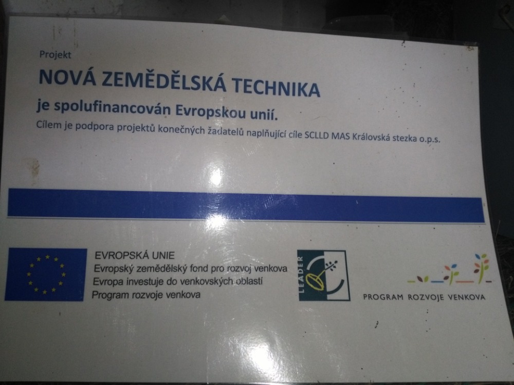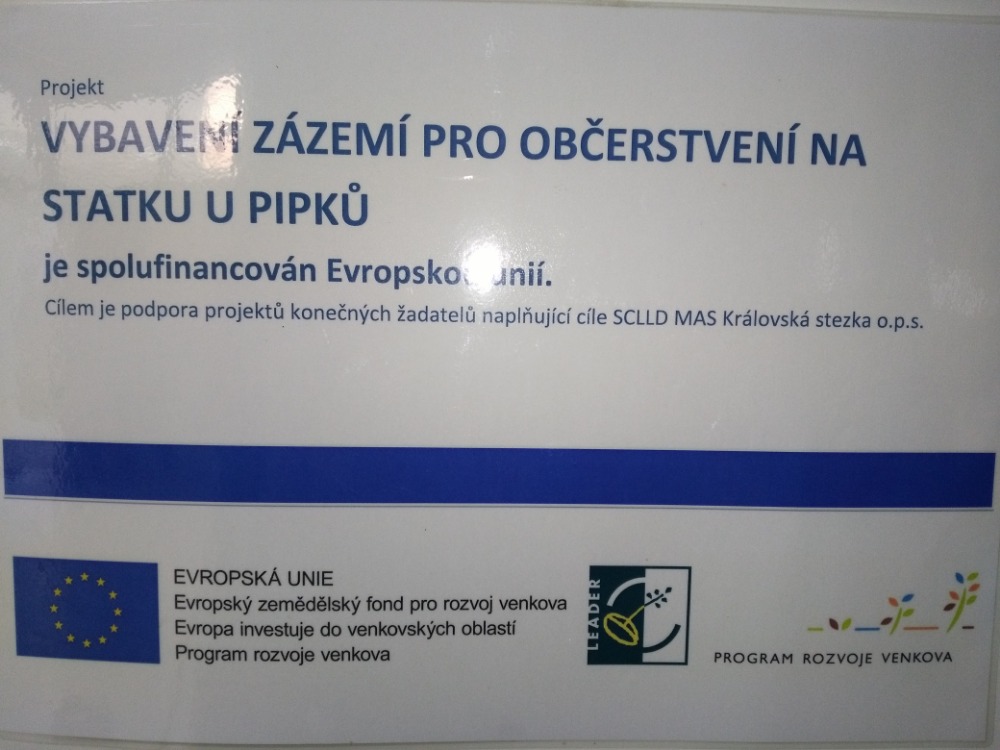 V rámci I. výzvy z Programu rozvoje venkova v rámci nezemědělské činnosti jsem ralizoval projekty "Nová zemědělská technika" - kde byl podpořen nákup zemědělských strojů a dále projekt "Vybavení zázemí pro občerstvení na Statku u Pipků" kde byl podpořen nákup vybavení občerstvení.